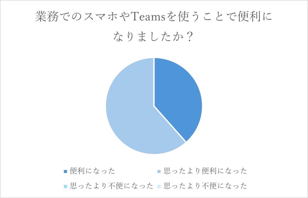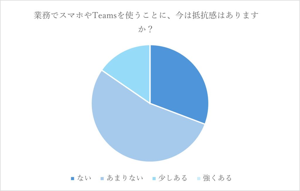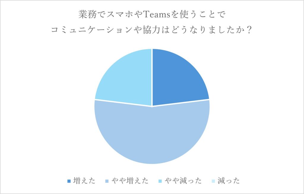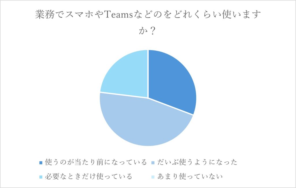 2024年に掲げた「全社員が当たり前のようにデジタルを使っている企業になること」という目標の達成状況を確認するため、現場社員アンケートを実施した。その結果、業務においてスマートフォンやTeamsを「当たり前に使っている」「だいぶ使うようになった」と回答する社員が多く、また「思ったより便利」「慣れたら簡単」と感じている回答が見られたことから、デジタル活用に対する心理的ハードルが低下し、日常業務への定着が進んでいることを確認した。今後のDX化を行える環境が心理的な点で整ったと考えます。